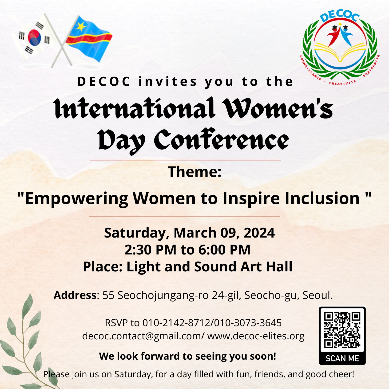 The Women’s Department of DECOC is delighted to announce the hosting of its 2nd Conference for International Women’s Day 2024, which will take place on Saturday, March 9, 2024, in the Light and Sound Art Hall.